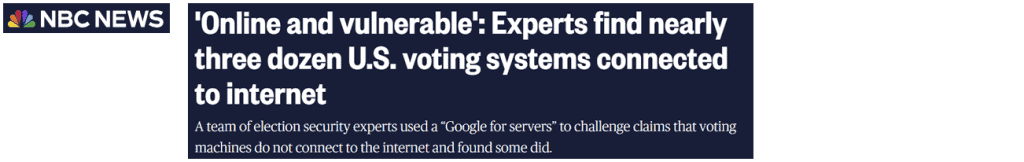 It’s obvious that connecting voting machines directly to the Internet through wireless modems or other means increases the vulnerability of those systems to hacking. Though we have frequently been told that voting machines are not connected to the Internet this is not always the case. Many states’ voting machines include wireless modems which transmit their unofficial results over the Internet. Some states allow their vote tabulation computers to be connected to the Internet.
