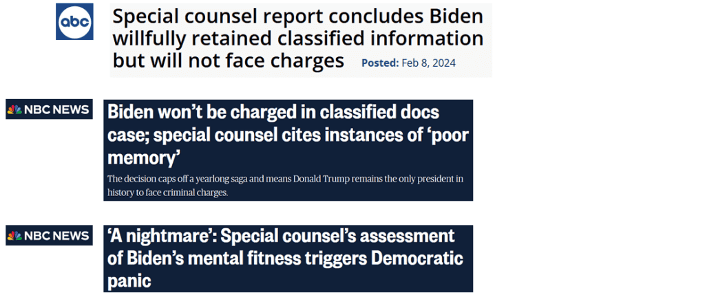 Feb 8, 2024: Biden gets off due to “failing memory” and that he is too old to understand what he did. But of course he can still run the country and run for president agian.